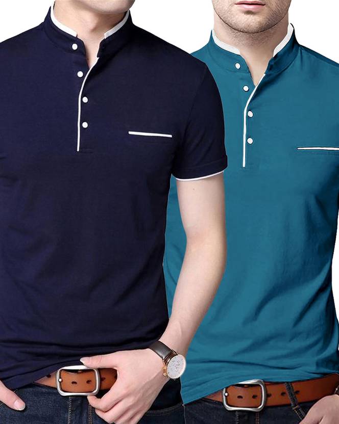 AUSK Solid Men Mandarin Collar Dark Blue, Blue T-Shirt