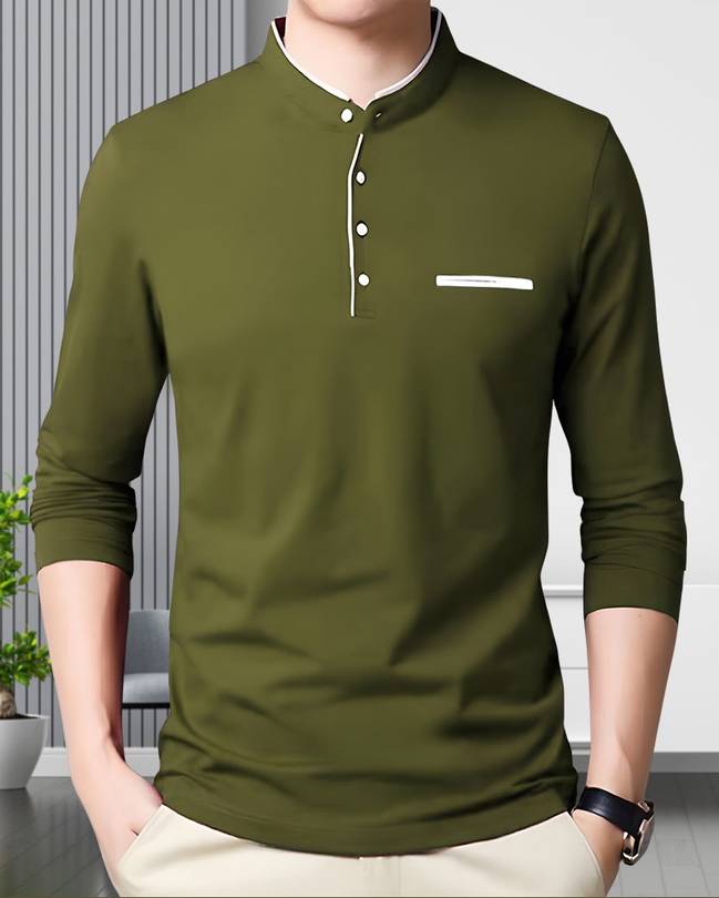 AUSK Solid Men Mandarin Collar Dark Green T-Shirt