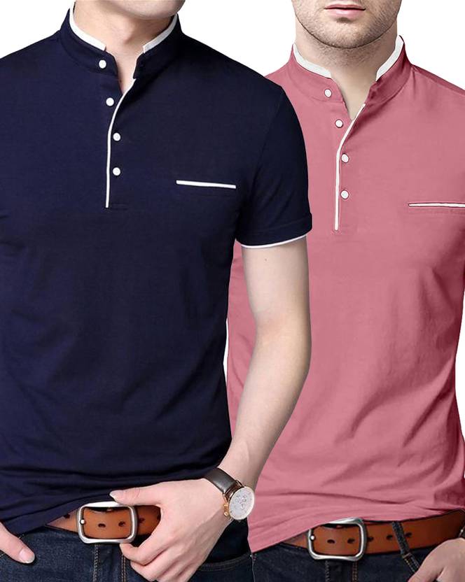 AUSK Solid Men Mandarin Collar Pink, Blue T-Shirt