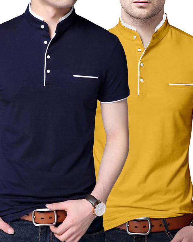 AUSK Solid Men Mandarin Collar Yellow, Blue T-Shirt