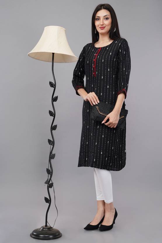 Print Type: Diagonal stripes with a minimalist aesthetic for a modern look., Button Detailing: Stylish buttons on the front placket for added charm., Collar Design: Mandarin collar offers a sophisticated and contemporary touch., Side Slits: Functional side slits for better mobility and comfort., Occasion: Perfect for casual outings, office wear, or small gatherings., Fabric Care: Easy-to-wash fabric for hassle-free maintenance., Seam Finish: Neat and durable stitching ensures long-lasting wear., Pairing Options: Best paired with leggings, straight pants, or palazzos for versatile styling., Season Suitability: Lightweight fabric makes it ideal for year-round wear.
