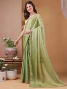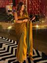 This saree is crafted from luxurious tissue fabric, known for its sheer, lightweight texture and rich metallic sheen. Woven using silk threads blended with golden metallic yarns, the fabric exudes a regal charm with a subtle shimmer that catches the light beautifully. Its crisp and slightly stiff drape holds structure well, creating an elegant and poised silhouette. The golden-bronze hue with an undertone of green adds depth and sophistication, making it a perfect choice for festive occasions, weddings, or evening events. This type of fabric not only enhances the wearer's grace but also brings a timeless, opulent appeal to the overall look.