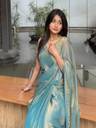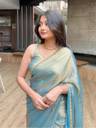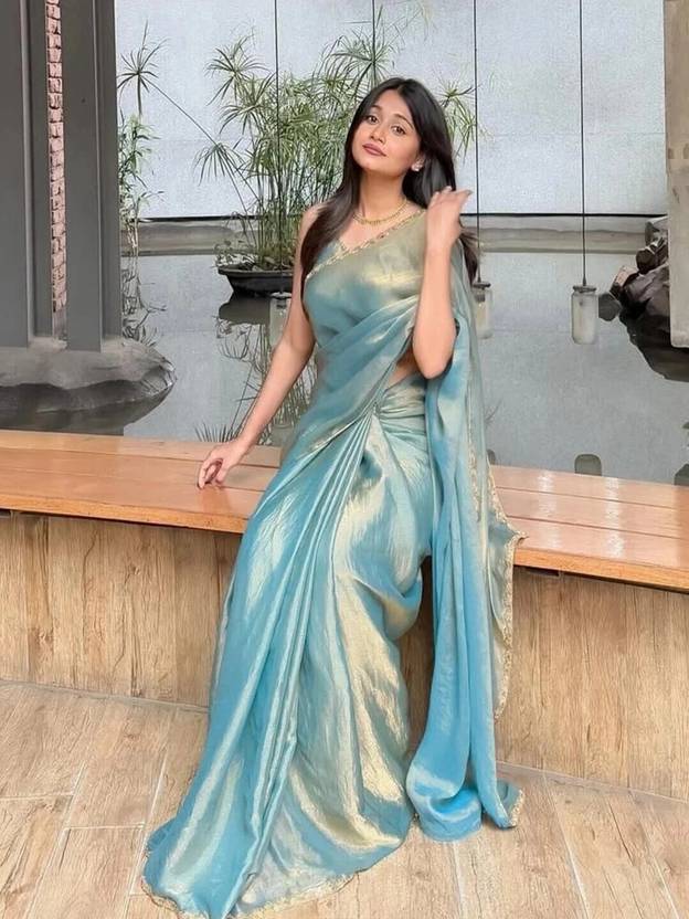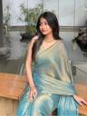 This saree is crafted from luxurious tissue fabric, known for its sheer, lightweight texture and rich metallic sheen. Woven using silk threads blended with golden metallic yarns, the fabric exudes a regal charm with a subtle shimmer that catches the light beautifully. Its crisp and slightly stiff drape holds structure well, creating an elegant and poised silhouette. The golden-bronze hue with an undertone of green adds depth and sophistication, making it a perfect choice for festive occasions, weddings, or evening events. This type of fabric not only enhances the wearer's grace but also brings a timeless, opulent appeal to the overall look.