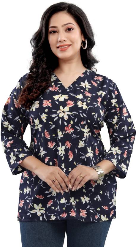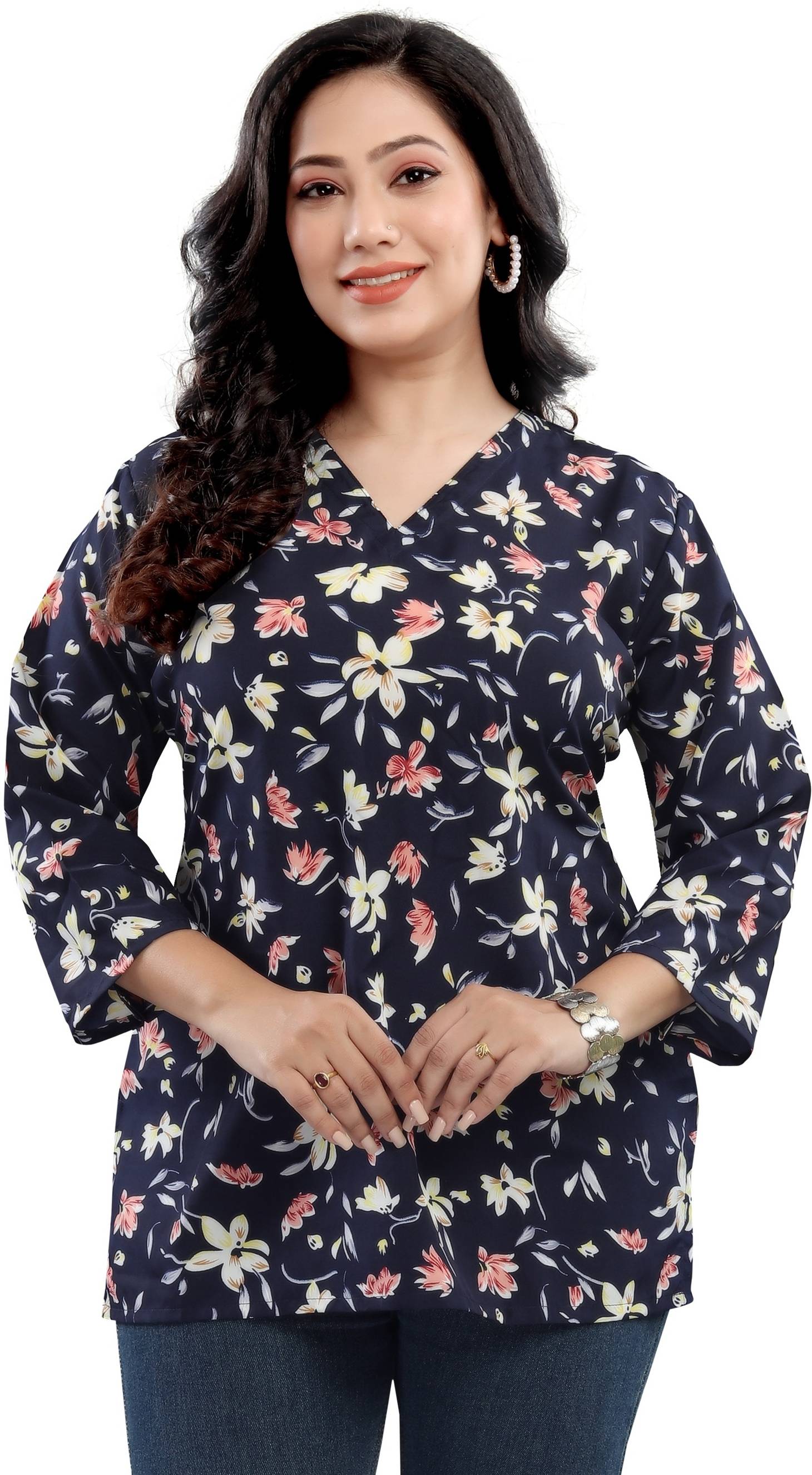 Women Crepe Top. V Neck and 3/4th Sleeves. Floral Print design.