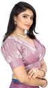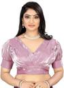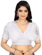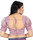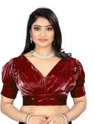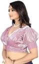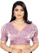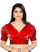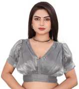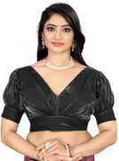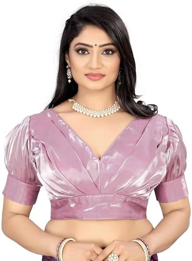 Organza blouse, Deep V-neck blouse, Puff sleeve saree blouse, Shiny silk blouse for saree, Pleated design blouse, Party wear blouse for women, Designer blouse for lehenga, Stylish blouse for festive wear, Modern Indian blouse design, Blouse with puff sleeves