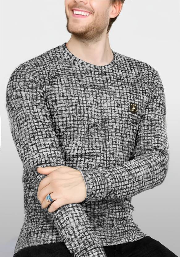 AVOLT Men Checkered Round Neck Polyester Grey T-Shirt