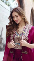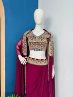 This outfit features a stylish lehenga and crop top set, complemented by a uniquely designed dupatta. The lehenga is full length, offering a graceful and traditional silhouette that flows elegantly with each step. The sleeveless crop top adds a modern touch, making it suitable for warm weather or layered looks. The dupatta is designed to be worn like a jacket, adding a chic and contemporary flair to the ensemble.