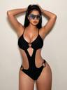Sporting a plunging neckline, the lingerie creates a deep V-shape that draws the eye downward along the torso. Strategic circular embellishments connect and frame the cut-out sections, lending a sense of symmetry and structure. High-cut leg openings contribute to an elongating silhouette, making the legs appear long and defined. Thin shoulder straps provide minimal coverage on top, enhancing the overall delicate look. Multiple geometric cut-outs add negative space throughout the torso area, creating a modern style with bold visual effect.
