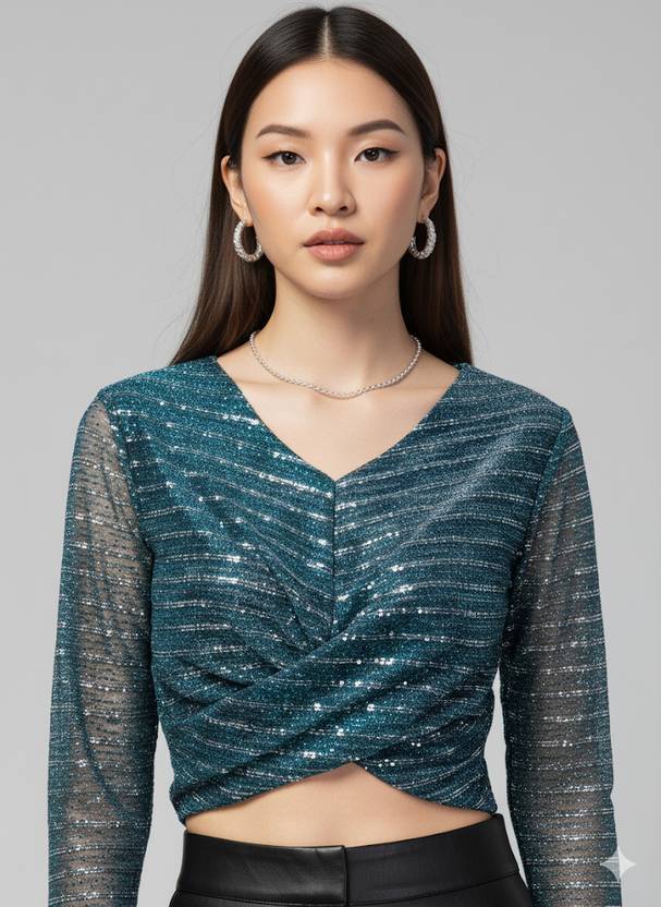 Upgrade your party wardrobe with this stunning women’s sequin mesh crop top, designed to make you shine at every occasion. Featuring a chic V-neckline, sheer long sleeves, and a trendy twisted front detail, this stylish top is perfect for party nights, clubwear, festive events, and evening outings. The lightweight mesh fabric with shimmering sequin accents adds a glamorous touch, while the crop length gives it a modern and fashionable appeal. Pair it effortlessly with skirts, jeans, or trousers for a statement-making look. A must-have trendy top for women who love elegant yet bold fashion.