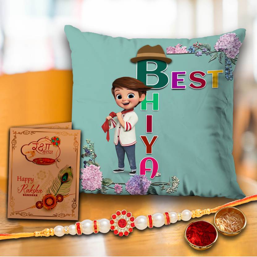 Rakhi Gift Hamper - Cushion, Greeting Card, Rakhi, Roli Chawal (Pack Of 4)