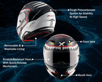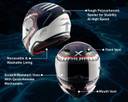 Offers panoramic vision with a visor that provides 70% wider visibility, along with scratch and UV resistance for a consistently clear view. It features a secure closure system, easy visor mechanism, quick-release functionality, and is Pinlock 30 ready for fog-free rides. A ducktail spoiler made of tough polycarbonate enhances aerodynamics and stability at high speeds.