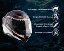 This helmet features a dual EPS liner designed to fit the head snugly, absorbing impact energy and preventing penetration for maximum safety. Made from high-protection ABS material, it weighs approximately 1500 grams and includes a secure D-ring chin strap to keep the helmet firmly in place. It also offers modern convenience with Bluetooth compatibility and removable, washable liners for added comfort.