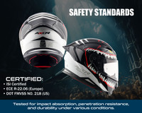 Meets top international safety standards, including ECE R-22.06 (Europe), DOT FMVSS No. 218 (US), and ISI certification. It undergoes rigorous testing for energy attenuation, penetration resistance, surface projection, rigidity, and tensile strength. All tests are conducted under four different conditions—hot, cold, submerged, and ambient—to ensure all-around protection.