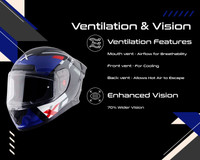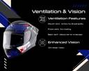 This helmet is designed to provide a panoramic vision. Its visor is not merely a shield, but a window to comfort and clarity because it provides 70% wider vision. It is even resistant to scratch and harmful UV rays, allowing a clear view of the path ahead. It is also equipped with a secure closure system, an efficient visor mechanism, and a quick-release functionality. In addition, it features Pin Lock 30.