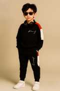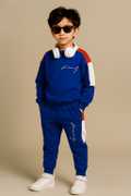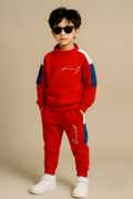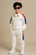 Elevate your child’s everydaystyle with this premium AYRA Fashion tracksuit, crafted from 100% soft, breathable cotton for all-day comfort. This stylish two-piece set features a cozy cream sweatshirt and matching joggers, both accented with bold red and blue panels on the sleeves and sides, adding a trendy athletic edge. The minimalist "KING" signature-style print on both the top and bottom enhances the overall chic look.