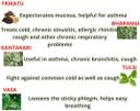 Expectorates mucous, helpful for asthma trats cold, chronic sinusitis, allergic rhinits cough and other chronic respiratory problems useful in asthma, chronic bronchitis, cough fight against common cold as well as cough lossens the sticky phlegm, helps easy breathing.