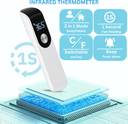 HOW TO USE: To use the non-contact infrared forehead thermometer, first ensure the digital IR thermometer has working batteries (AAA) installed, then press the power button to turn on the medical thermometer. To switch between Celsius (°C) and Fahrenheit (°F), long-press the same button for 5 seconds while the device is off. To select Body Mode for measuring core body temperature or Object Mode for surface temperature measurement, long-press the button for about 5 seconds while the device is on. Hold the non-contact thermometer 3 to 5 cm away from the forehead or target surface, ensuring the area is clean and free of sweat, hair, or dirt for accurate body temperature measurement. Click the button once, and the reading will appear on the LED display within 1 second, along with a beep sound. Identify fever easily through the instant-read thermometer’s colour indicators and beep sounds. The auto power-off function switches off the device after 8 seconds to save battery. For maintenance, avoid touching the temperature sensor or infrared thermometer sensor with your fingers. Clean the temperature checker gently using a soft, dry cloth or cotton swab. Store the fever thermometer in a cool, dry place away from direct sunlight. With proper usage and care, this IR digital thermometer serves as a fast, safe, and accurate health monitoring device suitable for homes, hospitals, and clinics.