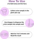 How to Use: Start using the early pregnancy test kit seven days before your menstrual cycle to test pregnancy by detecting hCG in your urine. Make sure to take the urine hcg test with your first urine of the day for the best results. Collect the urine test sample in the urine collector cups and use the dropper to transfer the sample to the pregnancy tester. The C line (control line) must appear for the pregnancy test to be valid. If both the C line and T line (test line) appear, the result is positive. If only the C line appears, the test is negative. If your menstrual period does not arrive as expected, use the normal pregnancy calculator one day after missing your period. Follow the same procedure as the early hCG pregnancy test to confirm pregnancy. All items are disposable and should be thrown away after use.
