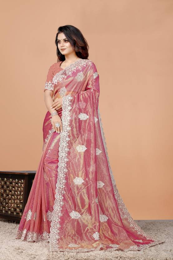 b bella creation Self Design, Embroidered Bollywood Supernet Saree (Pink)