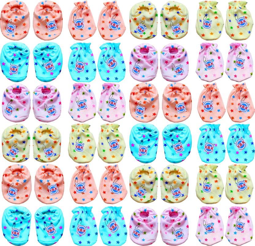 V.B.K products comes with combo pack of mittens and booties for your little baby. These are made of Hosiery Material. These mittens are the used to keep your little baby hands and Lags covered to avoid scratching. The delightful colours on white base and attractive prints give your baby's appearance an adorable charm. The mittens and booties come in a regular fit to let babies stay warm and breathable. The optimal size of the mittens/booties makes them a perfect fit for most babies. These mittens and booties are better than tie lace mittens/booties and safe for baby skin thanks to the elastic grip. They do not harm baby skin and they are very easy to wear and remove. The smooth, lightweight, and warm finish of the mittens and booties make them comfortable on babies in all seasons. The fabric keeps babies protected from skin rashes and itching. These Mittens Bootie set from V.B.K Are Used To Keep Your Little Baby Hands Covered To Avoid Scratching While Booties Set Will Protect Their Little Feet. Easy To Clean And Durable To Withstand Many Wash Cycles, Comfortable To Wear All Day Long. Soft Washable Multicolor Printed & Solid Set. Package Contents : 12 Pair Of Hand Mittens (Gloves) and 12 Pair Of Leg Booties (Socks) (Total : 24 Pair)
