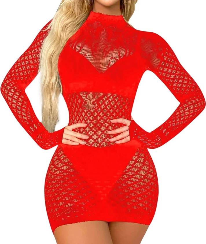 Womens Hollow Out Fishnet Bodycon Dress Mock Neck Long Sleeve Backless Mini Dress.