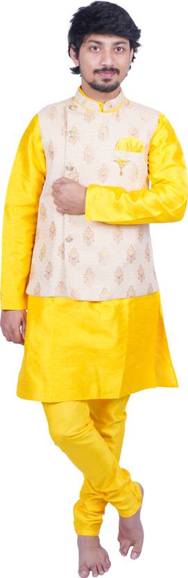 Men Cotton Blend Kurta Pyjama Ethnic Jacket Set