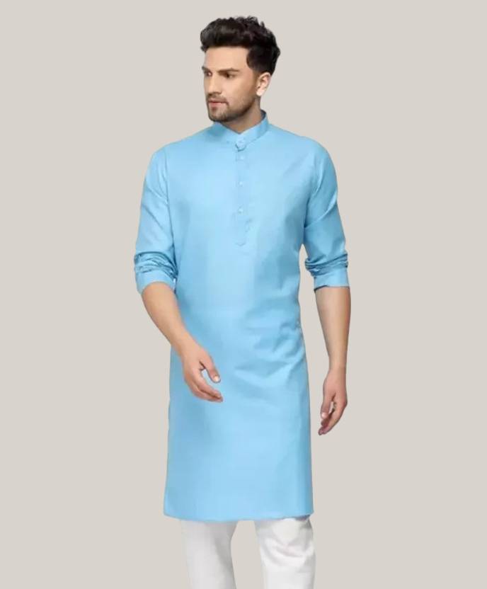 balajiis Men Solid Cotton Blend Straight Kurta (Light Blue)