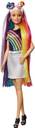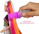 Young stylists can create colourful, shimmery hairstyles for Barbie doll with her gorgeous hair and styling accessories. Barbie doll has long hair with a rainbow of colour hidden underneath the long locks and a glitter comb to add sparkle. A brush, hair clips and rubber bands allow even more complex looks. And her outfit matches with a rainbow graphic on her black shirt, a silvery skirt, black shoes and a pink bangle. Style a look, take it down and style another. There are so many styles and stories to explore with Barbie