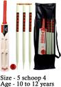 Featuring a comprehensive set that includes a bat, ball, cover, 2 bails, and 3 stumps in size 5 scoop 4, this cricket kit is ideal for children aged 10-12 years. This all-in-one set ensures that kids have everything they need to start playing cricket, from the essential equipment to a protective cover. Its size 5 bat is ideally suited for this age group, providing a balance of control and power that helps in developing proper technique. The inclusion of bails and stumps allows for a complete cricketing experience, whether for practice or matches, while its durable ball ensures consistent play.