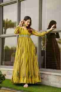 KRULRIN Printed Georgette Stitched Anarkali Gown (Yellow)