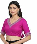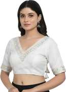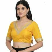 The blouse comes with soft padding, ensuring a perfect shape and enhanced comfort throughout the day. Its stylish deep V-neck front and back design, along with the decorative dori tie-up, gives a graceful and modern appeal. The short sleeves with matching border work make it ideal for sarees of all types—silk, chiffon, georgette, organza, or designer drapes.