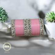 Boasting the sparkle of zircon stones, these chudas have a refined decorative quality. The zircon stones are thoughtfully embedded to add a layer of shimmer without overpowering the design. Their placement alongside the mirror work enhances the contrast between the elements, adding depth and elegance to the overall styling. The gemstones offer a soft, light-catching effect that elevates these chudas, making them feel dressy without being heavy.