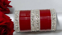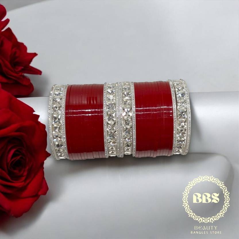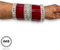 Showcasing an eye-catching mirror stone design, this Chuda bangle set offers a distinct and dazzling appearance. The intricate zircon stones enhance the overall aesthetic, giving these bangles a refined and elegant look. The stones are set in a way that reflects the light, adding a shimmering effect that can attract attention, making them ideal for various occasions, both casual and traditional.