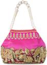 Crafted from rich maroon raw silk with premium green & gold thread embroidery showcasing an elegant elephant motif for a regal ethnic touch. Sturdy pearl-beaded handle adds grace and durability, making it a perfect match for festive and traditional outfits. Spacious interior (8.5 x 3 x 9 inches) ideal for carrying essentials like phone, keys, makeup, and more for weddings or parties.