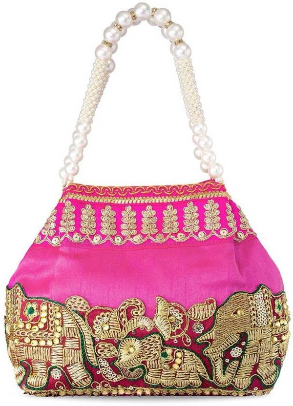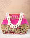 Elegant maroon potli bag in raw silk with intricate green & gold elephant motif embroidery. Features a pearl handle and drawstring closure—perfect for festive, bridal, or ethnic occasions.