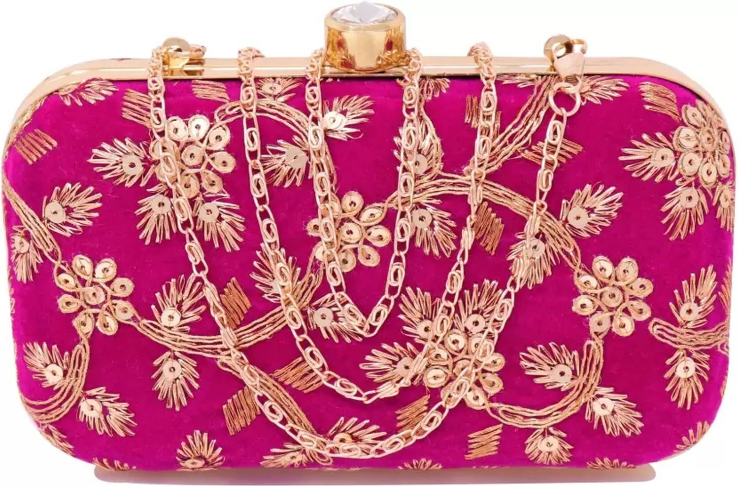 Crafted from rich maroon raw silk with premium green & gold thread embroidery showcasing an elegant elephant motif for a regal ethnic touch. Sturdy pearl-beaded handle adds grace and durability, making it a perfect match for festive and traditional outfits. Spacious interior (8.5 x 3 x 9 inches) ideal for carrying essentials like phone, keys, makeup, and more for weddings or parties.