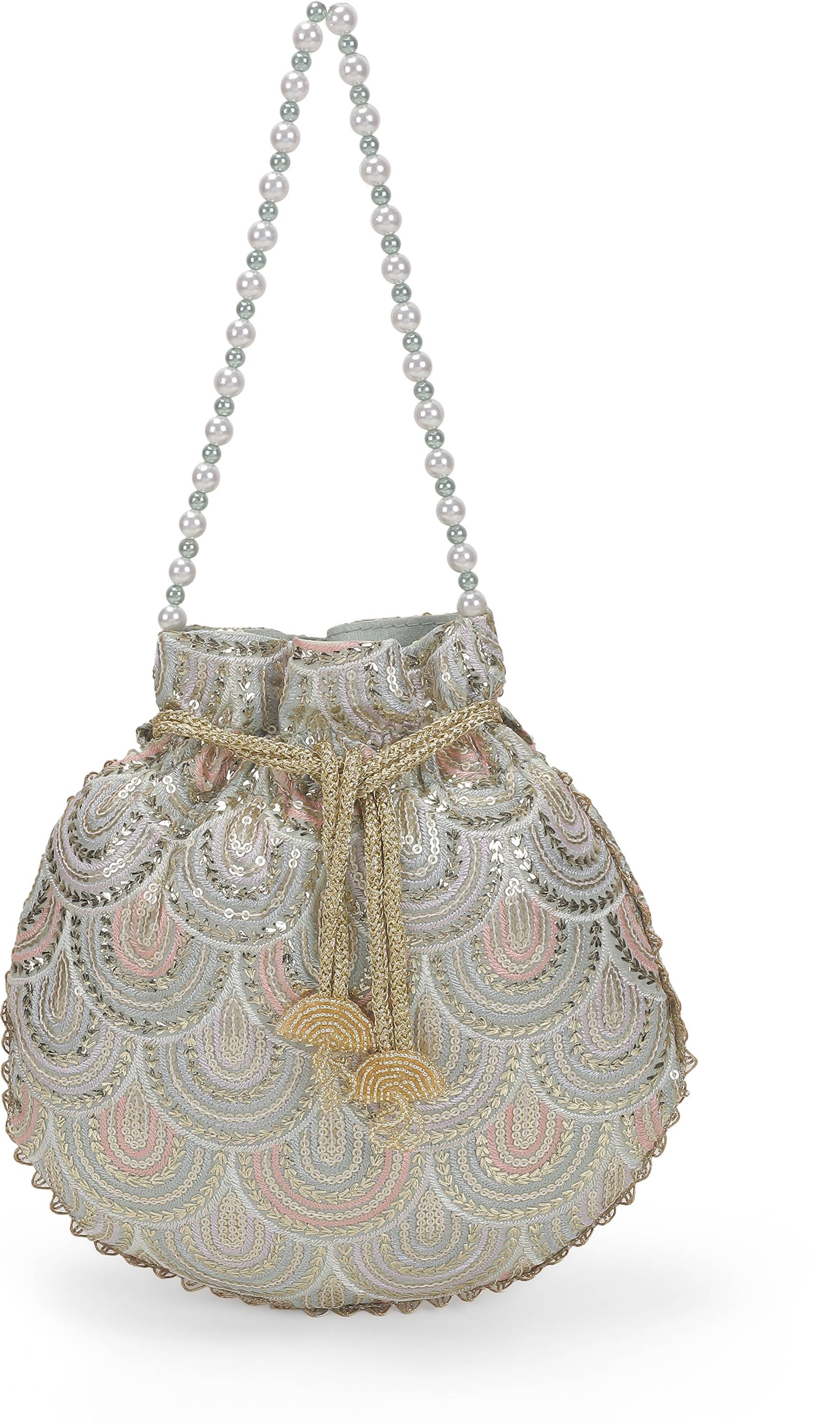 Crafted from rich maroon raw silk with premium green & gold thread embroidery showcasing an elegant elephant motif for a regal ethnic touch. Sturdy pearl-beaded handle adds grace and durability, making it a perfect match for festive and traditional outfits. Spacious interior (8.5 x 3 x 9 inches) ideal for carrying essentials like phone, keys, makeup, and more for weddings or parties.