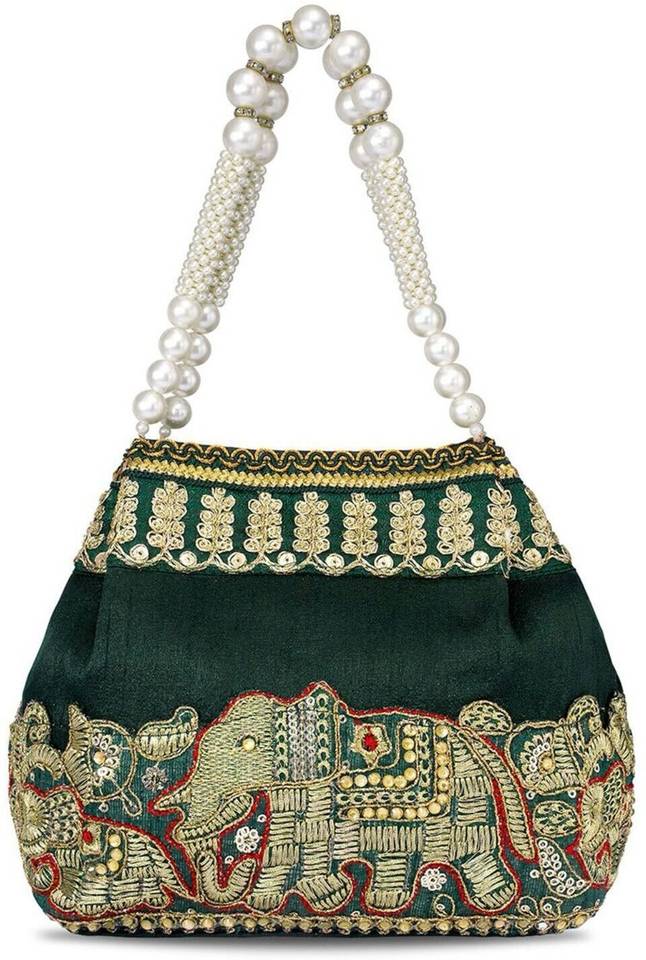 Elegant maroon potli bag in raw silk with intricate green & gold elephant motif embroidery. Features a pearl handle and drawstring closure—perfect for festive, bridal, or ethnic occasions.
