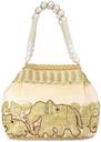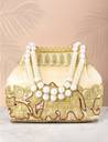 Crafted from rich maroon raw silk with premium green & gold thread embroidery showcasing an elegant elephant motif for a regal ethnic touch. Sturdy pearl-beaded handle adds grace and durability, making it a perfect match for festive and traditional outfits. Spacious interior (8.5 x 3 x 9 inches) ideal for carrying essentials like phone, keys, makeup, and more for weddings or parties.