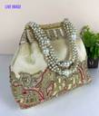 Elegant maroon potli bag in raw silk with intricate green & gold elephant motif embroidery. Features a pearl handle and drawstring closure—perfect for festive, bridal, or ethnic occasions.