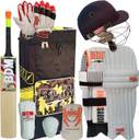 Complete Kit bag for all ages includes all the gear that you need. Available in various sizes and colors for different age groups. Kitbag made from heavy duty nylon material. External Bat Packet available. Cricket Kit Includes : Cricket Bat + Legguard + Batting Gloves + Kitbag + Thigh Guard + Arm Guard + Abdo Guard + Helmet
