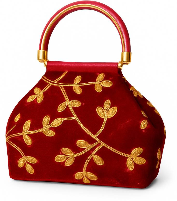 This luxurious handbag is crafted from premium deep red velvet, offering a rich and sophisticated appeal. The front is adorned with intricate golden floral embroidery, adding a touch of traditional elegance to its modern silhouette. Its semi-circular handle, wrapped in matching velvet and accented with polished gold metal, ensures a comfortable grip while enhancing the bag’s classy appearance. Spacious enough for your essentials, it is perfect for weddings, parties, festive occasions, and special events. Designed for women who appreciate timeless beauty, this piece blends craftsmanship, durability, and elegance, making it a must-have accessory for your ethnic and fusion outfits.