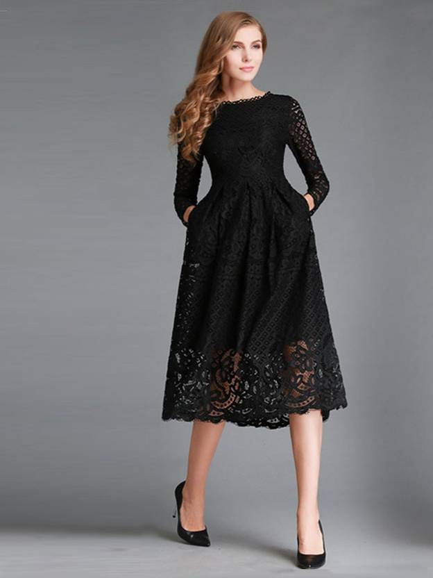Women Fit and Flare Black Midi/Calf Length Dress