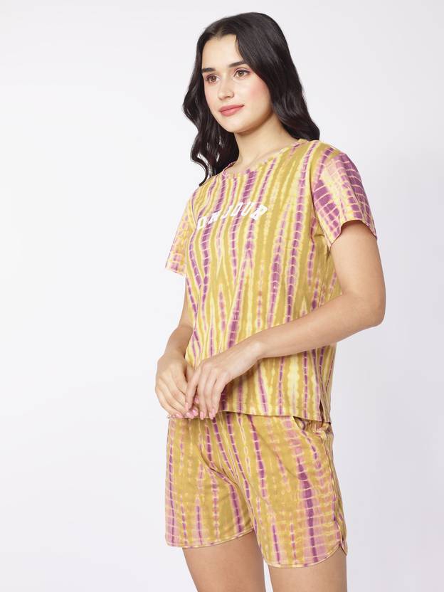 Sleeve Type: Half Sleeve | Neck Type: Round Neck Night Suit CoOrds set for Women Stylish | Material: Pique Hosiery Cotton | Pattern: Tie-Dye night suit co ords set | Two piece Nightwear: Tie-Dye Printed CropTop + 2 Pockets on Shorts (Co-Ord Shorts Set for women) | Purpose: night dress for women Cotton, sleepwear - loungewear - travel wear - home wear for women | Fit Type: Regular (Relaxed) Fit. Please refer Size Chart for perfect fit nightwear.