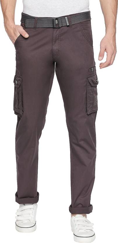 Beevee Mens Grey Solid casual mid-rise cargo pant with straight fit,100% Cotton fabric,has multiple pocket on the front and back, zip fly and button closure,beltloops,Comes with a matching fabric belt.