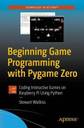 Make fun games while learning to code. Focused on making games rather than teaching programming theory, in this book you're more likely to see code on how gravity affects a missiles trajectory instead of the most efficient way to search through data. Even then the code is kept simple as games should be about playability rather than complex physics. There are links to the official documentation when you need to lookup information that isn't included in the book. Start with a simple text based game to grasp the basics of programming in Python. Then moves on to creating simple graphical games in Pygame Zero. Not only will you learn object oriented programming to make it easier to make more complex games, you'll also work to create your own graphics and sounds. 3D graphics are a little complex. So we focus on 2D games, including spins on some classic boardgames and arcade games. All the games are designed to run on a Raspberry Pi. They will work on any Raspberry Pi, butwill also work on any other computer that supports Python 3 along with Pygame Zero. The games you make will be playable and hopefully fun to play. And by the end of the book, you can step beyond the provided source code to develop your own unique games and programs. What You'll Learn Code in Python Generate sounds and graphics for 2D games Grasp object oriented programming with Pygame Zero Who This Book Is ForBeginning game developers interested in working with low-cost and easy-to-learn solutions like Pygame Zero and the Raspberry Pi.