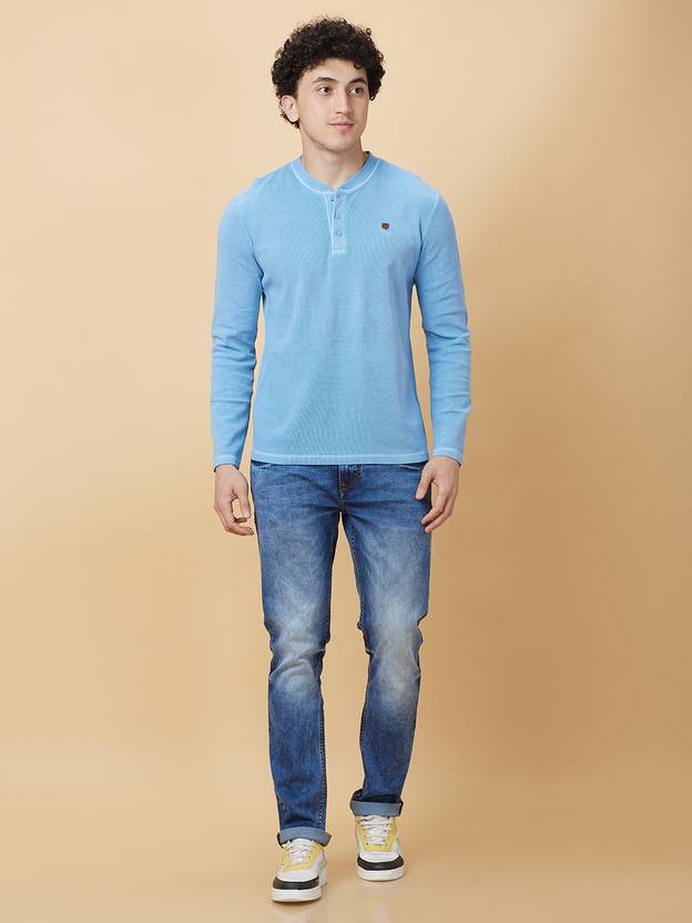 In every wardrobe should reside the perfect textured patterned t-shirt. As great as it is with joggers, they are with jeans, this lt.blue wash slim fit T-shirt will see you through endless casual occasions - from summer BBQs to your WFH attire. Made from breathable 100%-cotton fabric, this T-shirt will keep you feeling as cool as you look. The full sleeve also allows for easy movement. It's safe to say that this topwear has versatility and comfort to a T... shirt!