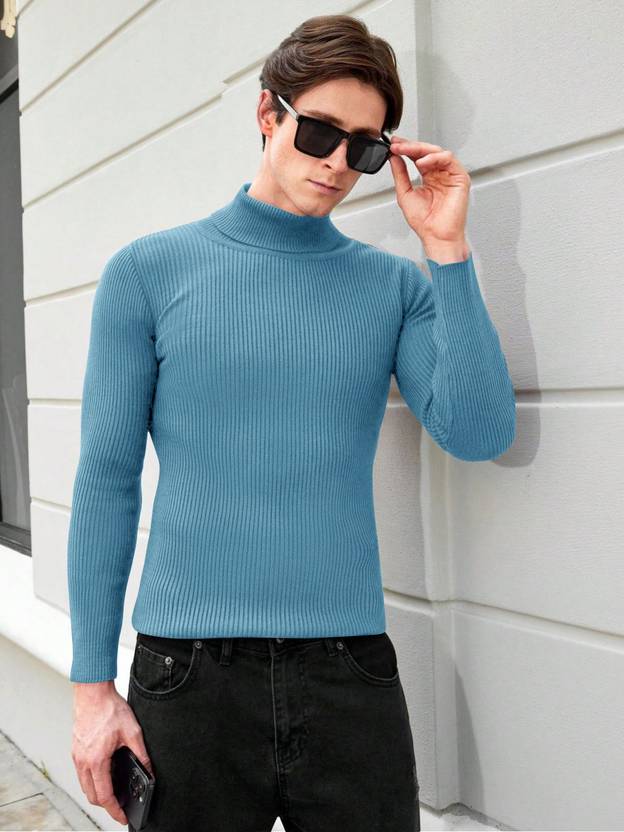BELACHY Solid High Neck Casual Men Light Blue Sweater