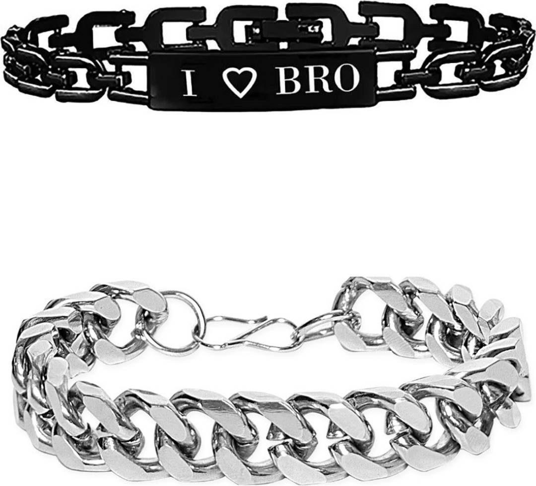 TRENDY ALLOY SILVER PLATED CHAIN BRACELET WITH BLACK I LOVE BRO BRACELET SET FOR BOYS AND MEN (PACK OF 2) COMFORTABLE AND NON-IRRITATING ON SKIN. IT IS SUITABLE FOR ALL OCCASIONS. PERFECT RAKSHABANDHAN GIFT FOR YOUR BROTHER.