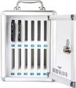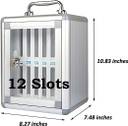 ?High Quality Material?The phone locker is made of aluminum alloy and clear acrylic. It's sturdy and resistant to pressure and drops. Built-in soft pearl cotton to prevent the phone from being scratched?Safe & Convenient?This mobile phone desktop storage box has a design with a safety lock, which can ensure the safety of items, and the transparent glass and writeable number make it easier to find the corresponding mobile phone.?Humanized Design?Our mobile phone holder storage box has a handle, which is convenient to carry. Back hook design, can be hung on the wall, saving space. With a stable bottom, it can also be placed on a table, placing and hanging very securely.?Store Multiple Phones?Our phone locker has 12 slots to choose from, one of them is a camouflage pattern, which is unique and individual, can hold multiple phones. Slots deep enough to hold phones of all sizes.?Wide Application?This mobile phone holder cabinet is not only suitable for classrooms, but also suitable for offices, factories, mobile repair shops, beauty salons, fitness clubs, restaurants, etc., safe and convenient.